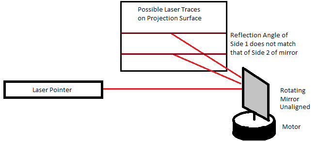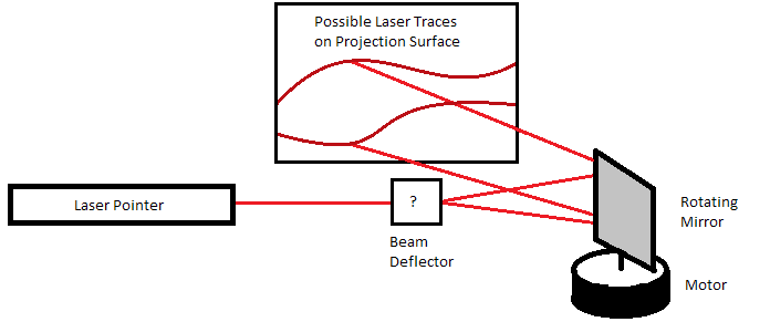 It is important to be aware of the design challenges in this project. There is a certain precision required for keeping a laser beam tightly collimated (collimated means the laser 'dot' size does not change even if it is pointed at a far away object, unlike a flashlight or lamp which are uncollimated. Passing a laser beam through a lens can make it uncollimated and act like a flashlight of a very specific color.). The first implementation involved a mirror mounted on a speaker so as to pivot about a certain angle as the speaker moves up and down. This change in angle of the mirror deflects the laser beam, and a second rotating mirror traces the signal over the projection surface at a certain speed. (In other words, the first mirror controls the Y-axis location of the laser beam and the second mirror controls the X-axis location).