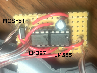 The strobe controller has been integrated with the spotlight circuit and is about to be sealed inside the frame of the spotlight