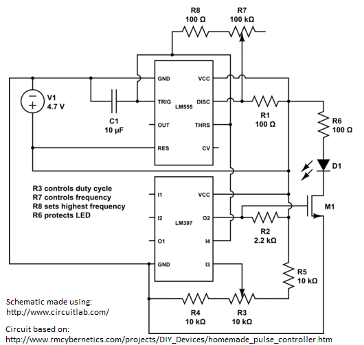 This circuit uses both an LM555 timer and an LM397 voltage comparator. You may notice that the output of the timer chip isn't used, this is because the comparator's output is driving the LED. Essentially, the 555 timer will charge and discharge the 10uF capacitor through the resistors, and each of those cycles counts as a 'flip' of the output voltage. The 100kOhm logarithmic variable resistor controls the strobe frequency and should be wired so that the faster rate of change occurs at the higher values of resistance, as with lower resistance values the charge/discharge frequency increases and finer control is necessary.
