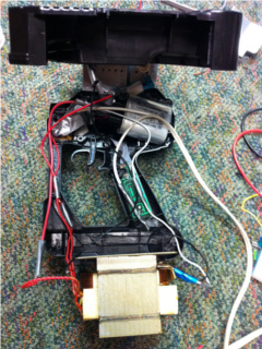 The guts of the microwave are taken out, and the circuit is kept intact. The transformer, capacitor, diode, and switches are then attached to the handle. Be sure that the cases of the transformer (and magnetron) are grounded (attached to the ground wire (third prong) on the power cable) to avoid a floating voltage that could hurt you when it is in close proximity to your body. To be on the safe side, design the handle so that conductive metal parts are very well insulated. My design has three layers - the coating on the wires, rated for the full voltage, covered by tape and air, followed by plastic insulation of the handle, followed by additional tape around the part of the handle where my hand will actually touch the gun. The transformer and magnetron are exposed but both are grounded, and would be hard to touch during operation. The wire going to the electrical outlet should contain a small knot inside the handle, that will prevent the wire from being pulled out of the handle during use.
