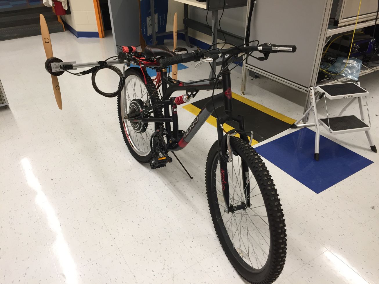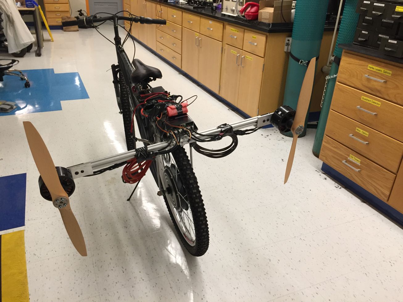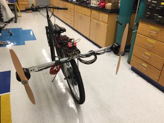 I initially thought about making a very big quadcopter that would be capable of lifting my weight as an ultralight personal flying device. To test the viability of the idea, I purchased two motors and motor controllers to do initial thrust measurements. These measurements were successful but the sound level, vibration, and power draw were very high so I decided to not pursue the quadcopter idea further (though such large-scale devices have been successfully built). If you are interested in a large scale flying device of this sort, I would recommend using small fuel-powered jet engines instead of electric motors. So with that idea passed over, I put together a silly project attaching the two motors onto a bicycle, so that the bicycle is accelerated by propellers. It is an inefficient and unsafe way to power a bicycle (just connect the motors to the wheel...) but it was a fun idea to test. It turns out this was not a novel idea either, as hobbyist propeller powered bycicles were built as early as 1920 and certainly many more times in the 2000s.