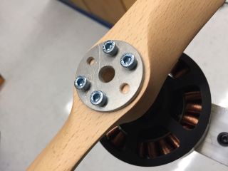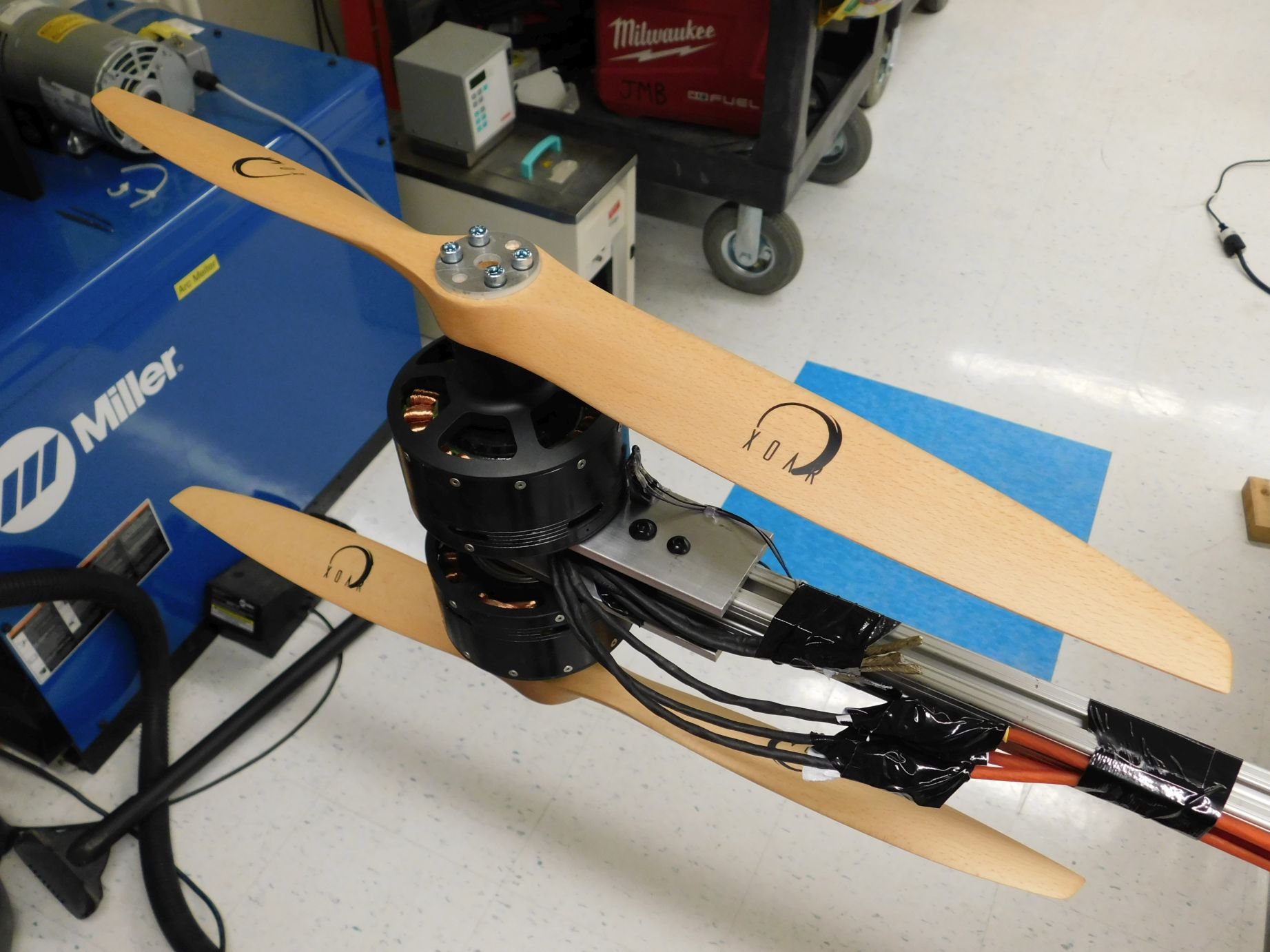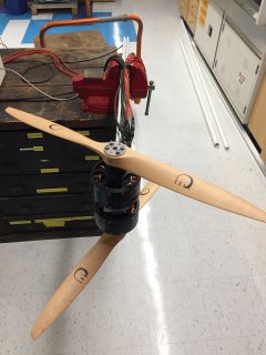 The motor used is a brushless 10850 size motor, 16S, 250 kv, 7 kW with ESC, which was a custom kV order supplied by "Dongguan Freerchobby Co., ltd" on Alibaba and here. The motor and ESC worked according to the specifications and the motor build quality was good, so if you are looking for a motor supplier, this company seems trustworthy. The propellers are XOAR PJA 1803 24x8 on top and 24x12 on bottom, spinning in opposite directions (pusher configuration). The pusher configuration ones were also a custom order, though the size is standard, and the propellers I received were of high quality, so I can recommend this company as well.