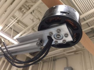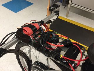 Test results, in text format, can be downloaded as a zip file here. Note that the data is recorded in terms of hardware counts, and the conversion factors are given in the top lines of the files. A video of the spin-up and spin-down process can be viewed here (21 MB mp4) - the thrust of about 40 lbs visibly lifts the table corner and creates significant air flow in the room, in addition to being very loud. At the end of the test I rapidly changed the ESC setpoint to zero from full throttle, and the resulting inductive kick caused some small explosion from the circuit board. With the ESCs being so finicky, and the need to buy many more motors to achieve enough thrust for flight, I decided to halt the project. While I still had the motors set up, I decided to test out their thrust when placed on a bicycle.