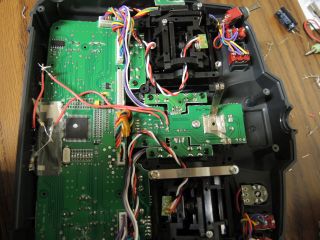 The transmitter is taken apart to remove the screen. At this point it is also possible to switch springs on the sticks so switching from Mode 1 to Mode 2 type controls is possible.