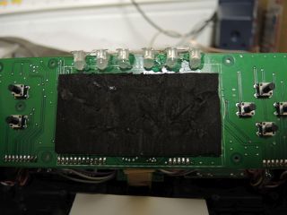 A plastic sheet and reflective sheet from an LCD are cut to size of the transmitter's display, and six illumination LEDs are glued to the circuit board. The LEDs draw power directly from the transmitter's battery and are on whenever the transmitter is on (wired to the mechanical switch).