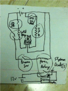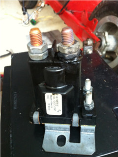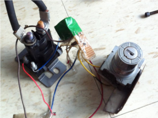 Left to right, the power relay, the latching circuit, and the key switch. The handlebar switches and battery power would be connected using the various wires coming from the circuit, while the motor would be connected to the thick black wires on top of the power relay.