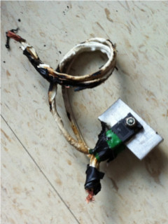 The melted wires connecting the two flyback diodes to the motor. The diodes are fine thanks to the large aluminum heatsink (there is one diode on each side of the heatsink).