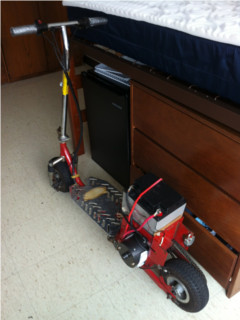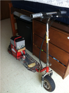 Side views of the scooter, from front and back. With all the control electronics fitting inside the red box, the outside of the scooter looks fairly neat. If there were a better way to attach the battery, it would even look professional.