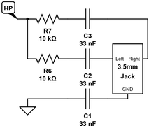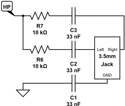 The headphone jack is connected with this fully isolated arrangement to allow simple pulse generation. Whenever the digital signal HP transitions to 0V or 3.3V, an impulse sound can be heard through the headphones.