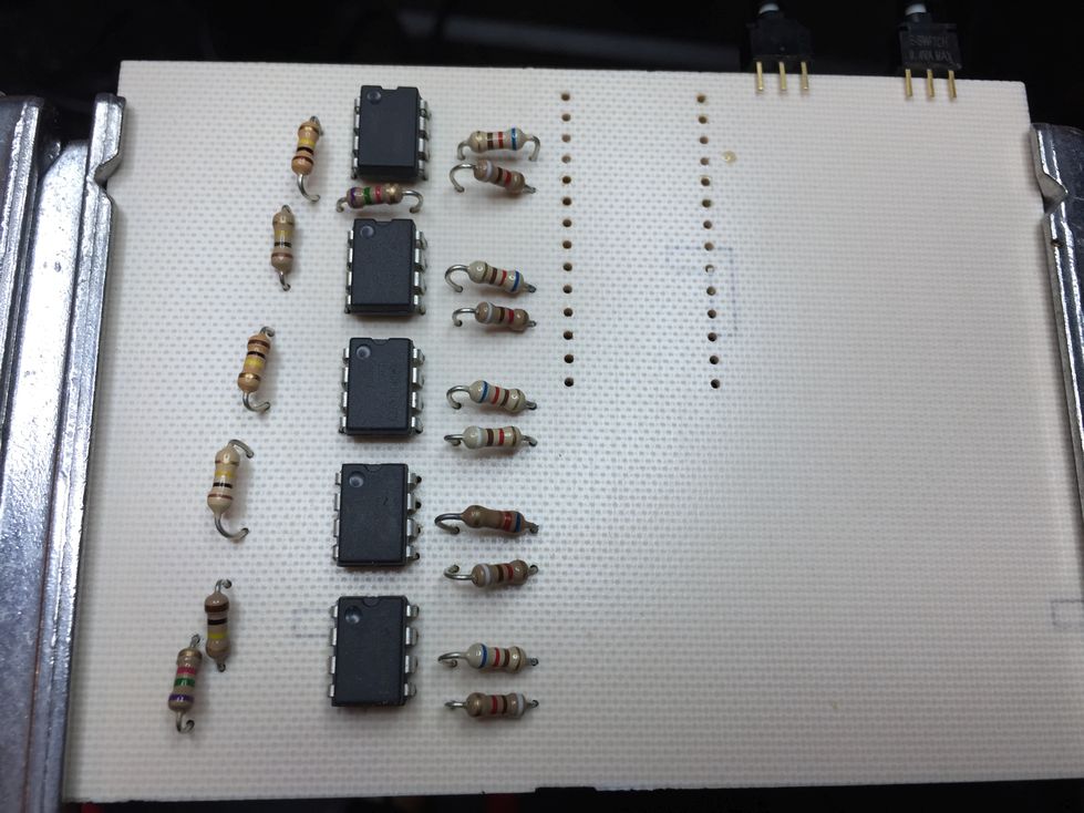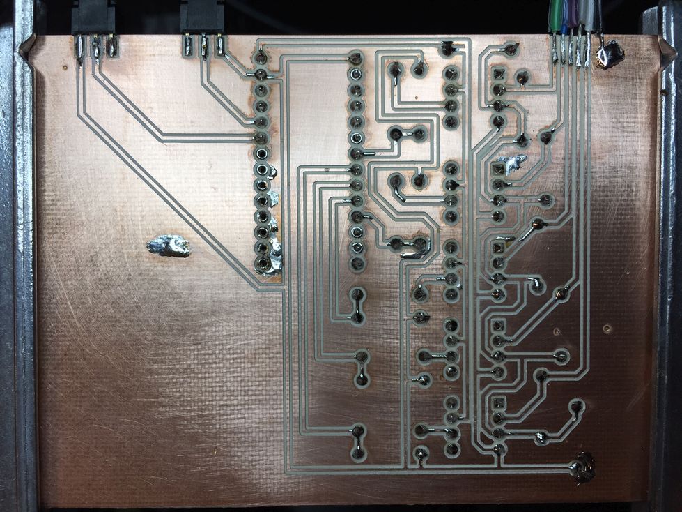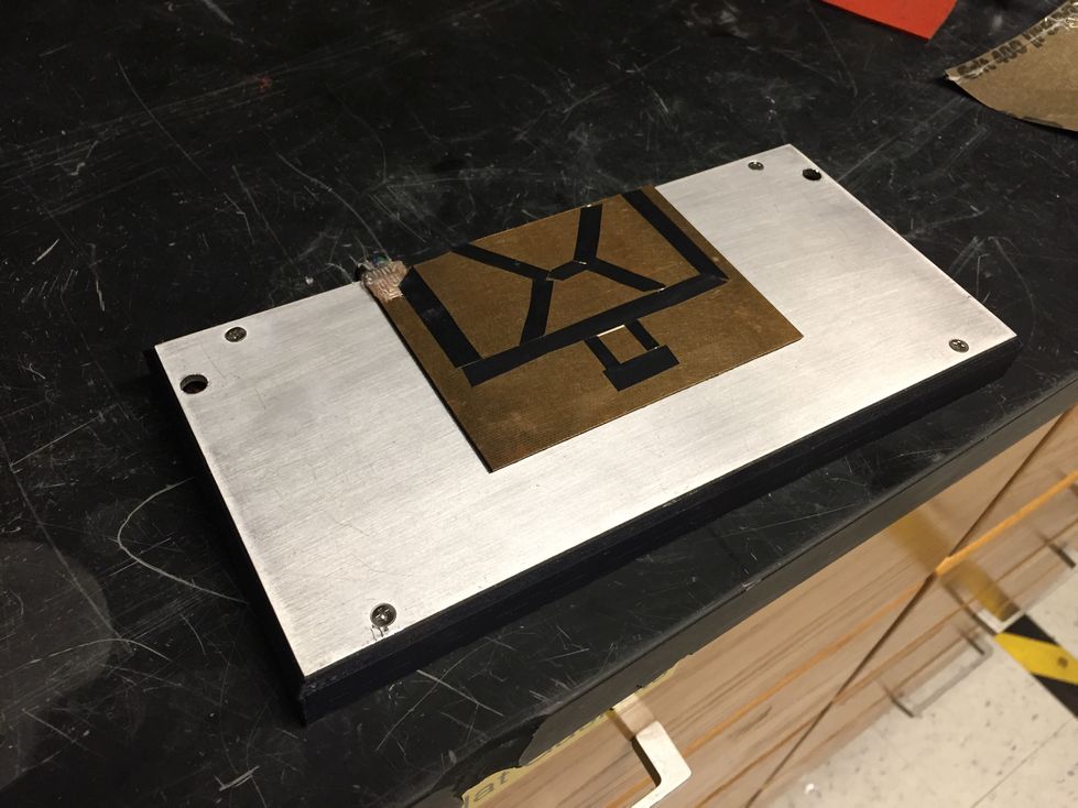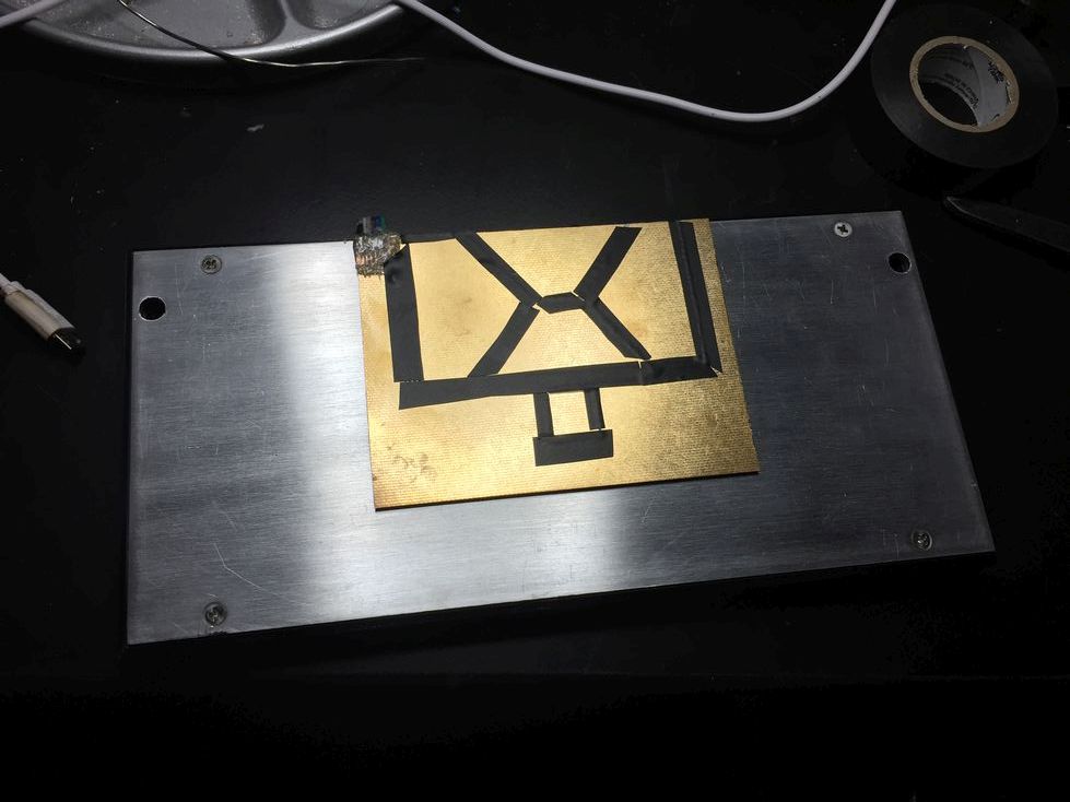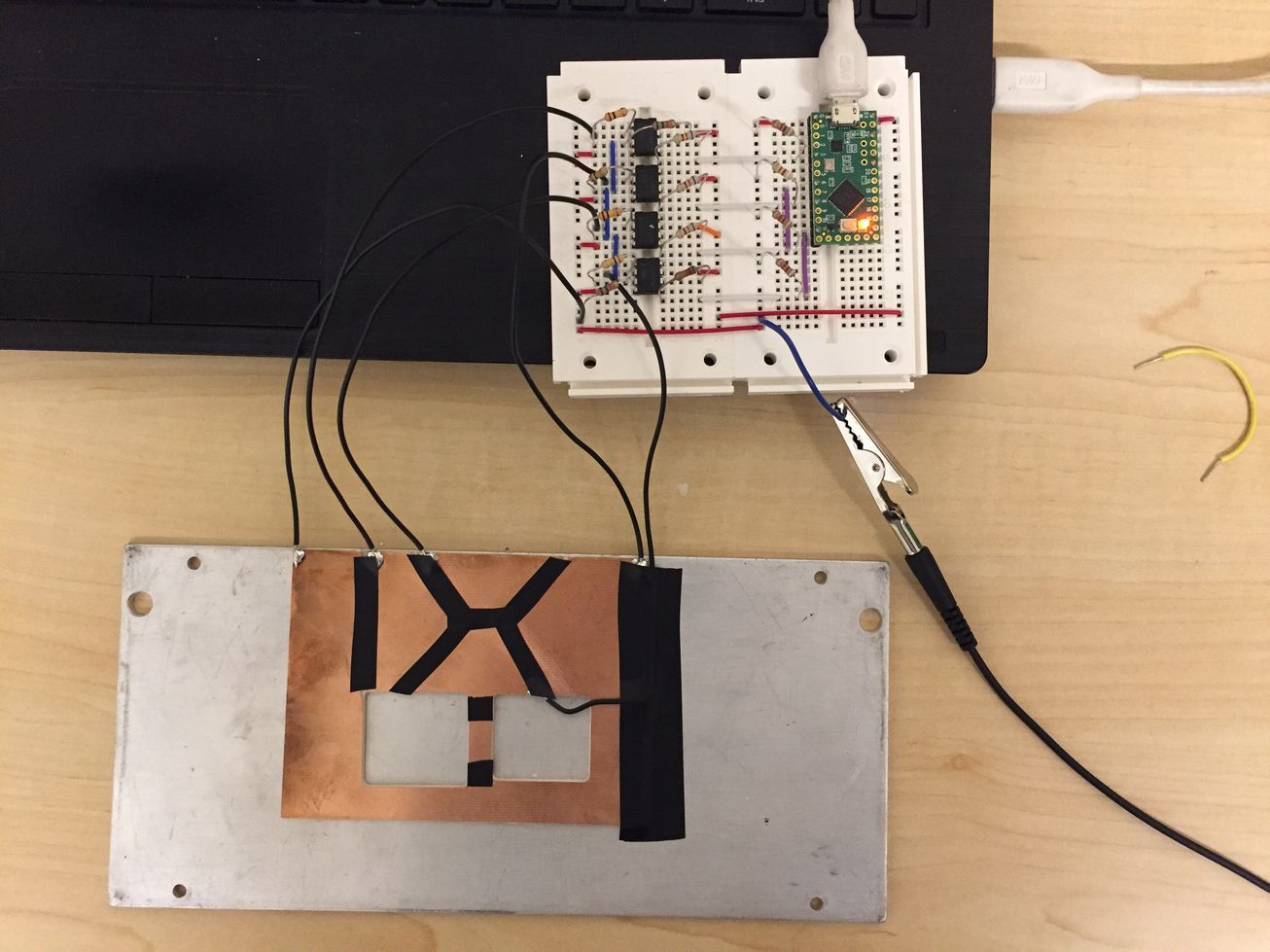 The prototype was completed in a rapid manner by using a rotary tool with a cutoff wheel to etch lines into a single-sided copper circuit board from the scrap pile, and these lines separated the different areas of each touch button. Then wires were soldered on, and electrical tape was used for additional insulation and tactile feedback at the edges of the buttons. These were then connected to op-amps on a solderless breadboard.