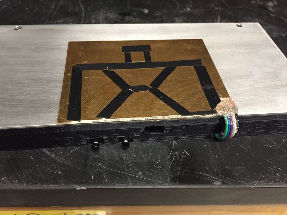 Finished controller, top view. Electrical tape is used to insulate the areas between the touch pads, both to avoid accidentally activating adjacent areas with one touch, and to provide tactile feedback of the area boundaries due to the thickness of the tape. Ideally this sort of thing could be done with a vinyl cutter so it doesn't look this messy.