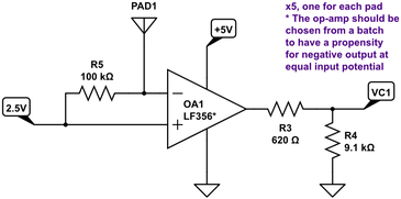 There are 5 op-amps, each connected to a touch pad (PAD1 here), and wired alike. Resistor R5 sets the sensitivity of the op-amp; higher values mean a lower current from the touch sensor will be sufficient to generate a high output. Resistors R3 and R4 ensure the output VC1 to the Teensy will not exceed 3.3V (these could be eliminated if a rail-to-rail op-amp powered off 3.3V is used instead of the LF356).