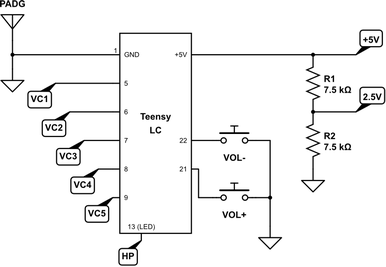 Circuit connections to the Teensy LC include the 5 op-amps (digital input), 2 volume control buttons (digital input with internal pull-up), and 1 headphone signal (digital output). A 2.5V comparator rail is made by dividing the 5V from the USB connection.