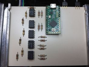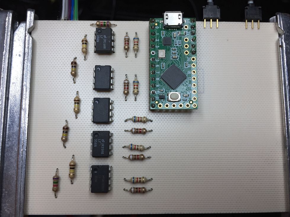 The Teensy LC is the main controller, and the algorithm here is very simple. The Teensy measures five digital inputs, and if one is high, it sends out a command over USB to the computer (these represent the four arrows and a central pad). When a release is detected, a 1/60 second timer commences, before the release signal is sent to the computer. This way if the input goes high again within the span of an AC cycle, the button is considered to be held continuously, and spurious noise is rejected. The Teensyduino package makes the PC interfacing very easy - simply install and set the board mode to Joystick+Keyboard+Mouse+Serial, and the Joystick.Button command to programmatically press and release buttons becomes automatically available. No need to worry about USB packets and drivers. Overall I've had great success with PJRC Teensy boards and this project kept the trend. The Teensy LC is a 3.3V board, while the op-amps run at 5V, so each op-amp has a resistive voltage divider to scale its output to 3.3V; the 5V is the primary power source drawn directly from the USB connection.
