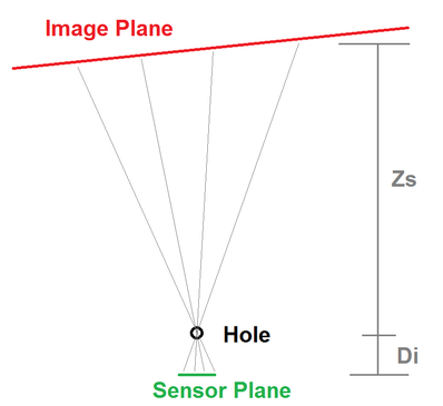 To put the problem in mathematical terms, we write the function that projects from the real 3D space (x, y, z) to the pixel space (px, py) with the pinhole at the origin (0, 0, 0) and the pixel plane parallel to the XY plane and passing through (0, 0, -Di), with the pixel (0, 0) also occurring at that point. Realistically, the image in pixel space will be flipped horizontally and vertically after passing through the pinhole, but here we use an imaginary 'reversed' pixel plane where this flipping does not occur. This corresponds to an absence of a multiplicative factor of -1 in the formulas for px and py: