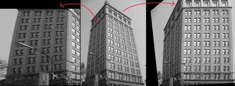 This photo of a building has been straightened in two ways, on both of the walls making up the corner that was photographed. The left side shows some effects of lens distortion since the straightened image has a bit of curvature.