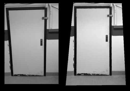 The left photo of a door has been straightened on the right so the door is nearly rectangular. Note the effect on the border of the original photo, it is as if one held the photo at an angle.
