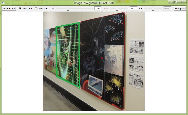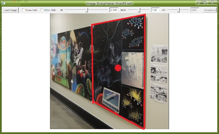 Drag each of the red rectangle corners to outline a rectangle in the image. Also, you can drag the central red dot to move the entire rectangle outline. The program is not guaranteed to work if you switch the order or orientation of corner points while dragging (that is, top left->top left, etc). It is not guaranteed to work otherwise either, but there is probably a higher chance of it working. If you drag the corners outside the image area or want to start over with the selection at any point, click Load Image and then Cancel out of the dialog. That will reset all UI elements to their original settings.