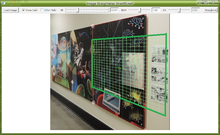 The green grid shows the plane containing the outlined rectangle, once W has been adjusted. The outer edges were drawn thicker in this photo for clarity. The grid should outline squares in the image, if it outlines rectangles the output image will be stretched either horizontally or vertically.